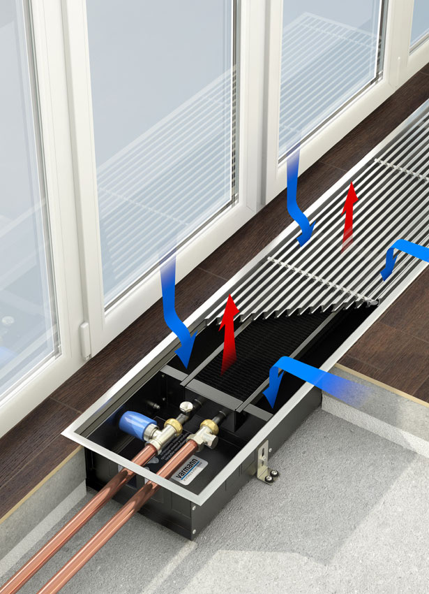 Принцип работы внутрипольного конвектора заключается в естественном или принудительном передвижении потока теплого воздуха.