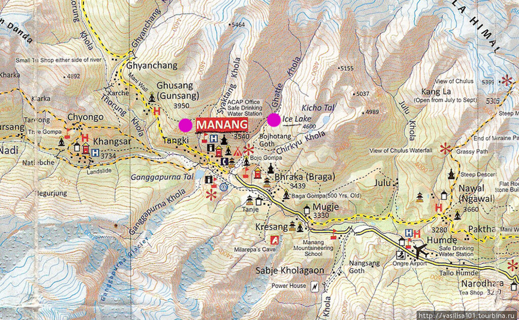 Идем на завтрак, в кафе своего отеля, а потом сразу бежим в отель наших знакомых. А то австрийцы люди шибко пунктуальные, ждать особо никого не будут. Вдруг слышу впереди знакомое «привет!» Дурге с рюкзаком стоит. А вот и Маша с Алексеем, набирают воду в бутылки (в Мананге тоже есть пункт с "save water"). Рассказывают, что Айслейк не то чтобы очень красив, а по дороге дует сильный ветер и солнце прямо в глаза. Ну ладно, от солнца кремом я намазалась (правда, Дима все еще не верит, что может сгореть на горном солнце, наивный чел, хо-хо), шапку от ветра с собой взяла, то есть прям подготовилась. Правда, нет у меня треккинговых палок как у Маши с Алексеем. Говорят, что с ними действительно проще. Когда спрашивала, еще в Катманду, нужны ли мне палки, сказали что нет. Типа, трек не сложный. Пока что так и было. Пробовала для интереса даже ходить с бамбуковой палочкой (которая была длинновата, но Сони это исправил, лихо разломив палку напополам об голову, к моему полнейшему восторгу), но никакой пользы от нее не почувствовала, только движений больше делать надо. Вот, подозреваю, в сегодняшнем походе палки и правда пригодились бы.