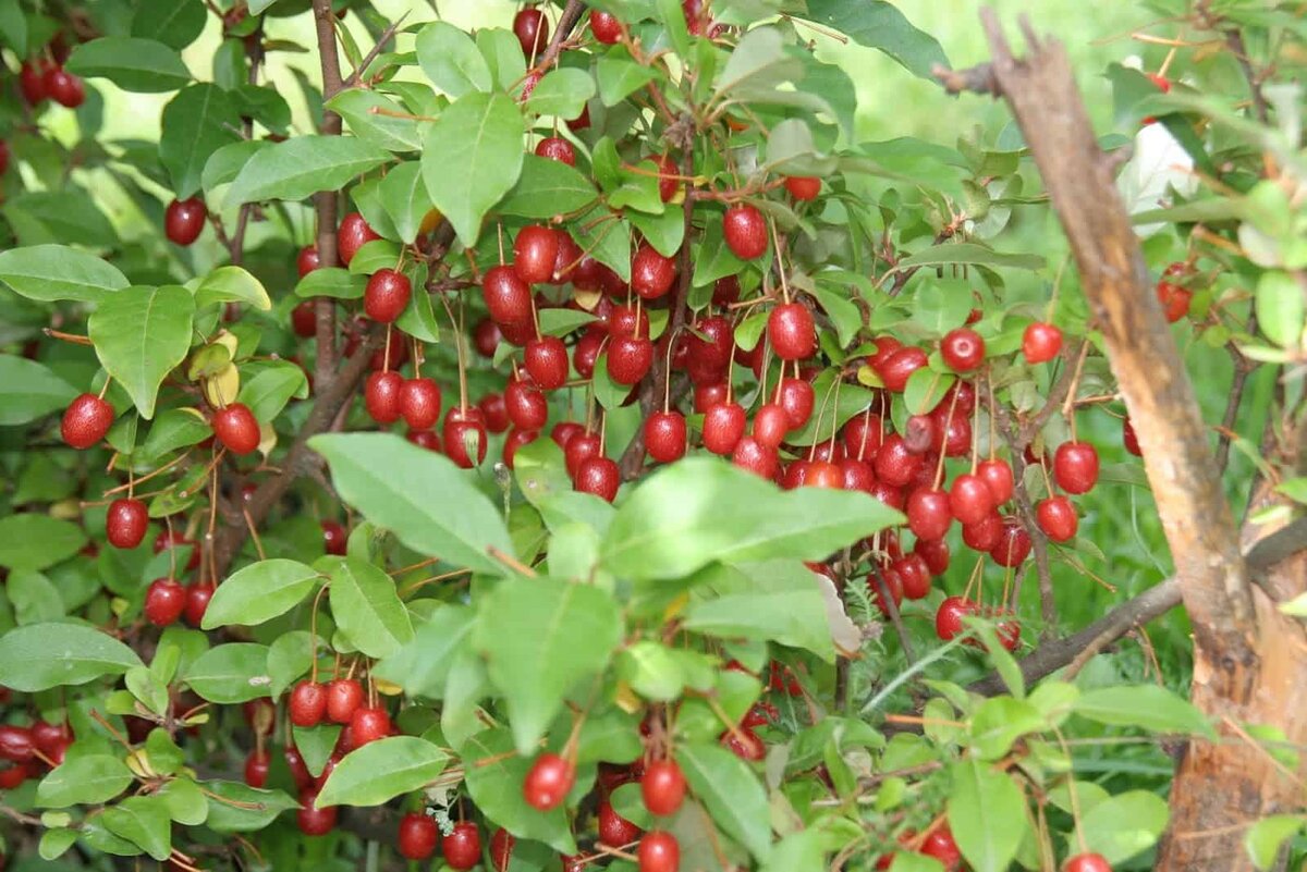 Гумми – родственник облепихи, но отличается по вкусу. Листья у растения жесткие, как восковые, бело-зеленые летом и желтые – осенью. Плоды созревают неравномерно, на ветке одновременно может быть зеленые, желтые и красные ягоды, что придает кусту декоративный вид.