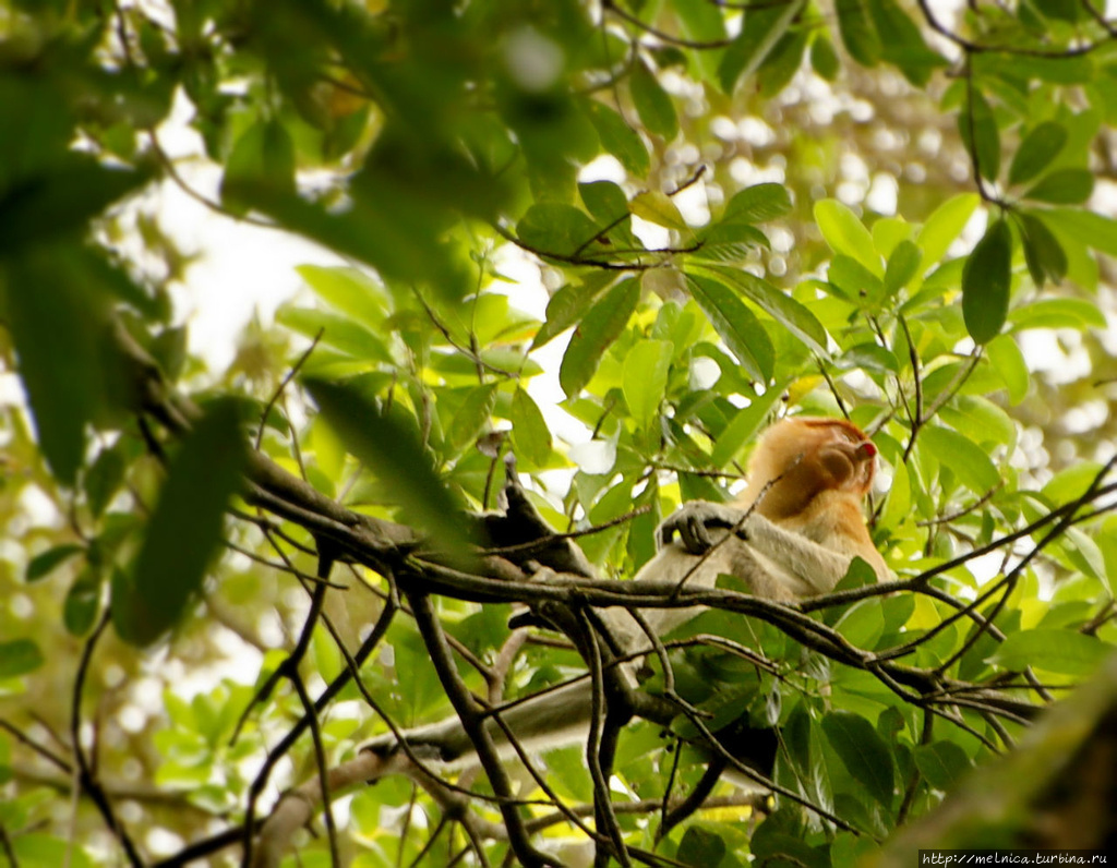 Выглянув в окошко, я увидела недалеко от моего домика группу людей, смотрящих куда-то вверх. Ясно: снова носатики завтракать пришли! Быстро одевшись и схватив камеру, я побежала тоже понаблюдать за сидящей на огромном дереве компанией пробоскисов.