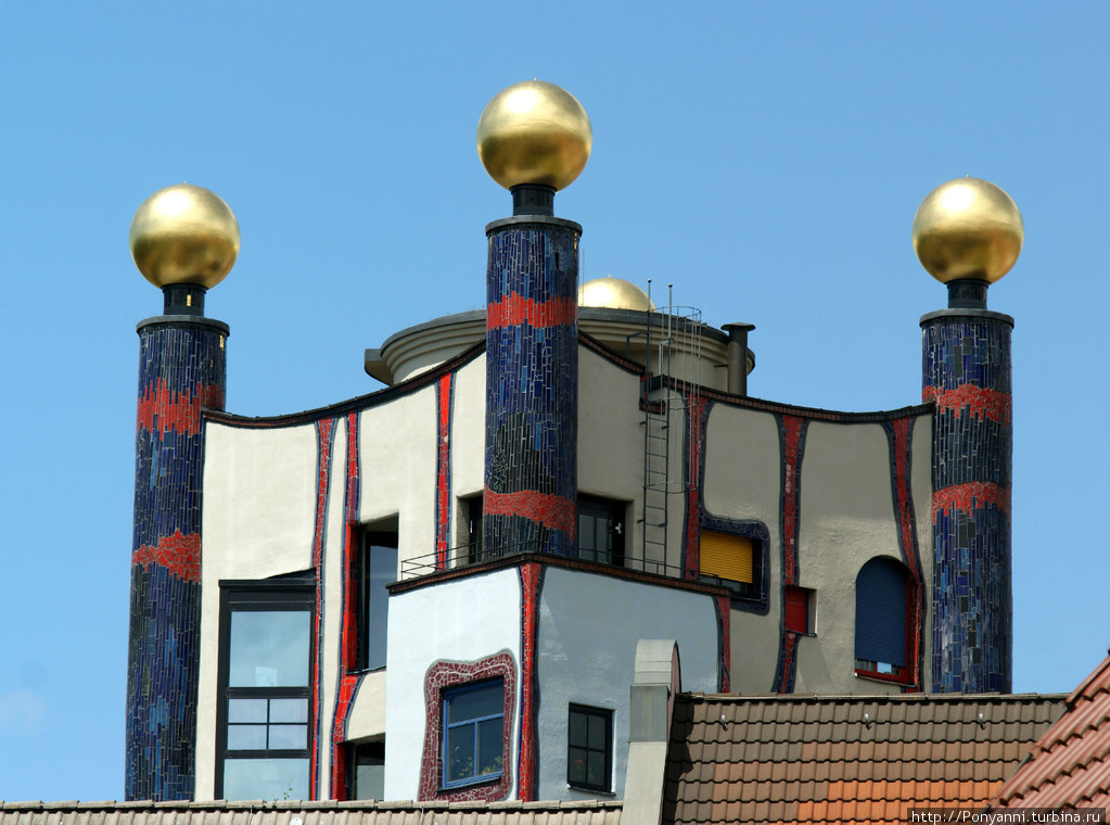 Совсем недалеко от Штутгарта, на берегу Неккара, в небольшом городке Плохинген можно увидеть одно из уникальных зданий, оформленных по эскизам художника. Жилой комплекс "Под дождевой башней" является замкнутым