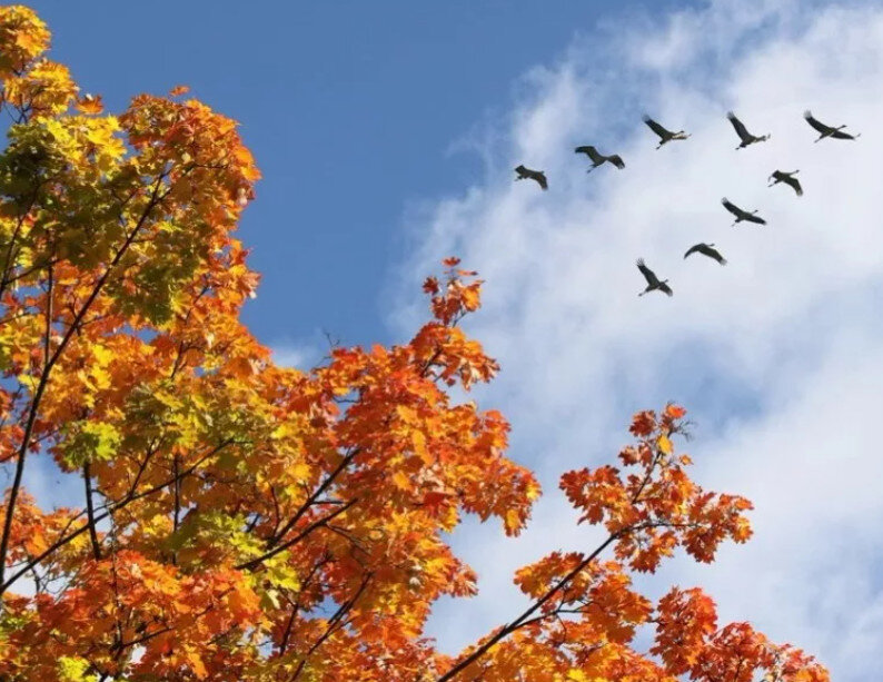 Затихли журавли за топкими лугами,