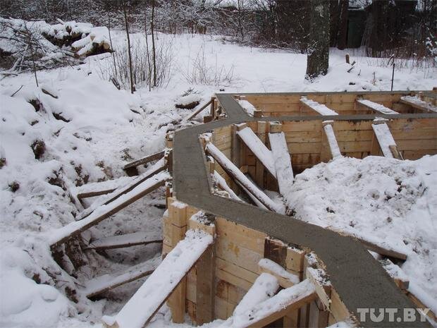 «Входные данные: фундамент — простой прямоугольник 9×12 м, капитальная стенка посередине. Грунт — жуткая глина. Была прокопана траншея 120 см, засыпано 10 см песка, уложен на низ каркас из 5 прутов арматуры, по стенкам — рубероид, залито бетоном до уровня земли. Воткнуты вертикалки. Этот этап прошел нормально. А вот с опалубкой произошла беда. Плохо закрепили, в результате она практически вся по низу разошлась, нет ни одной стены ровной. Как ровнять выпертые стены по вертикали? Пока представляю себе это так: аккуратно нарезать болгаркой штробы и зубилом аккуратно отбивать куски. Остальную кривизну фундамента догонять либо раствором, либо штукатуркой, либо утеплителем 2 см».