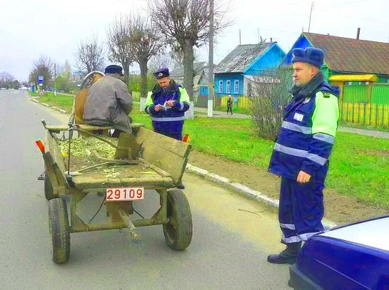Следующим утром выехал как обычно. На улице жарко, но дедушка не унывал, ехал, напевал песни. Едет через лес, а тут кусты, деревья и вдруг замечает сотрудника ДПС. он махнул палкой, стал осматривать бричку, говоря: