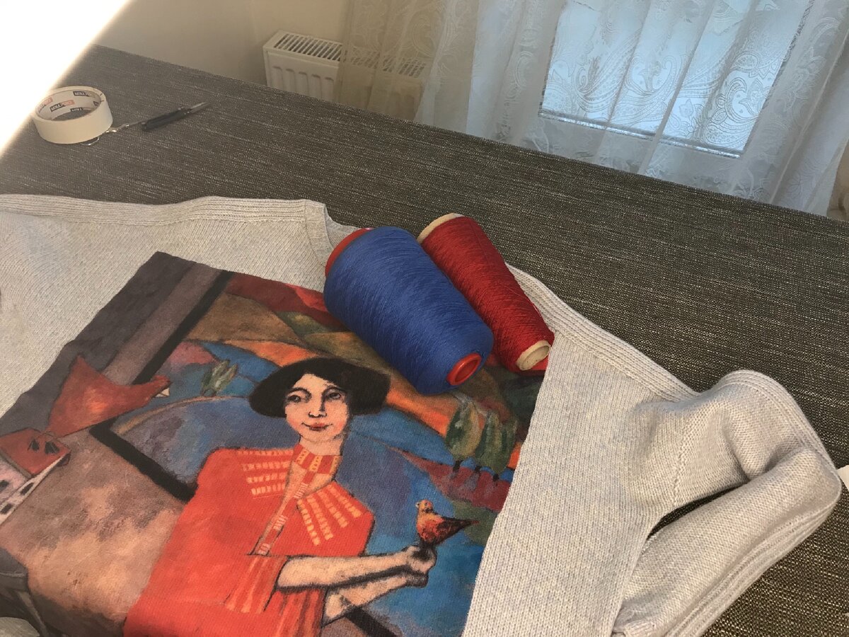 Затем я зафиксировала аппликацию по периметру ручными стежками нитью контрастного цвета. Для дополнительной фиксации по периметру я использовала обычный малярный скотч