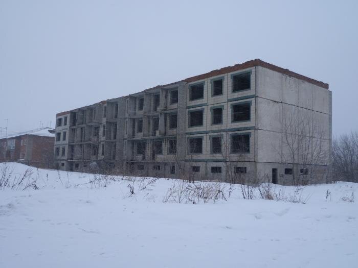Данный недострой был известен мне давно. С 90-х годов маячил возле станции. Но все никак не удавалось туда пробраться. И все же несколько лет назад это получилось! И как выяснилось, вовремя... Почему? Объясню чуть позже. Итак, немного истории. Эта панельная коробка находится в небольшом населенном пункте - поселке при местном заводе. О самом заводе можете прочитать здесь. Из капитальных построек присутствуют двухэтажные кирпичные многоквартирные дома. Помимо этого, есть и одноэтажные кирпичные домики. И вот такие вот деревянные на несколько квартир. И вот в свое время (в 80-х), видимо, в рамках расширения поселка, решили построить многоэтажную панельку. Но что-то не срослось, и стройка благополучно остановилась на стадии внешней готовности. Внутри, разумеется, ничего интересного нет и не было. Кое-где были смонтированы кирпичные перегородки, но они во многих местах были разбиты. Инженерное обеспечение, и коммуникации подвести не успели (ну или я их не нашел, ибо в подвал не лазил). Что