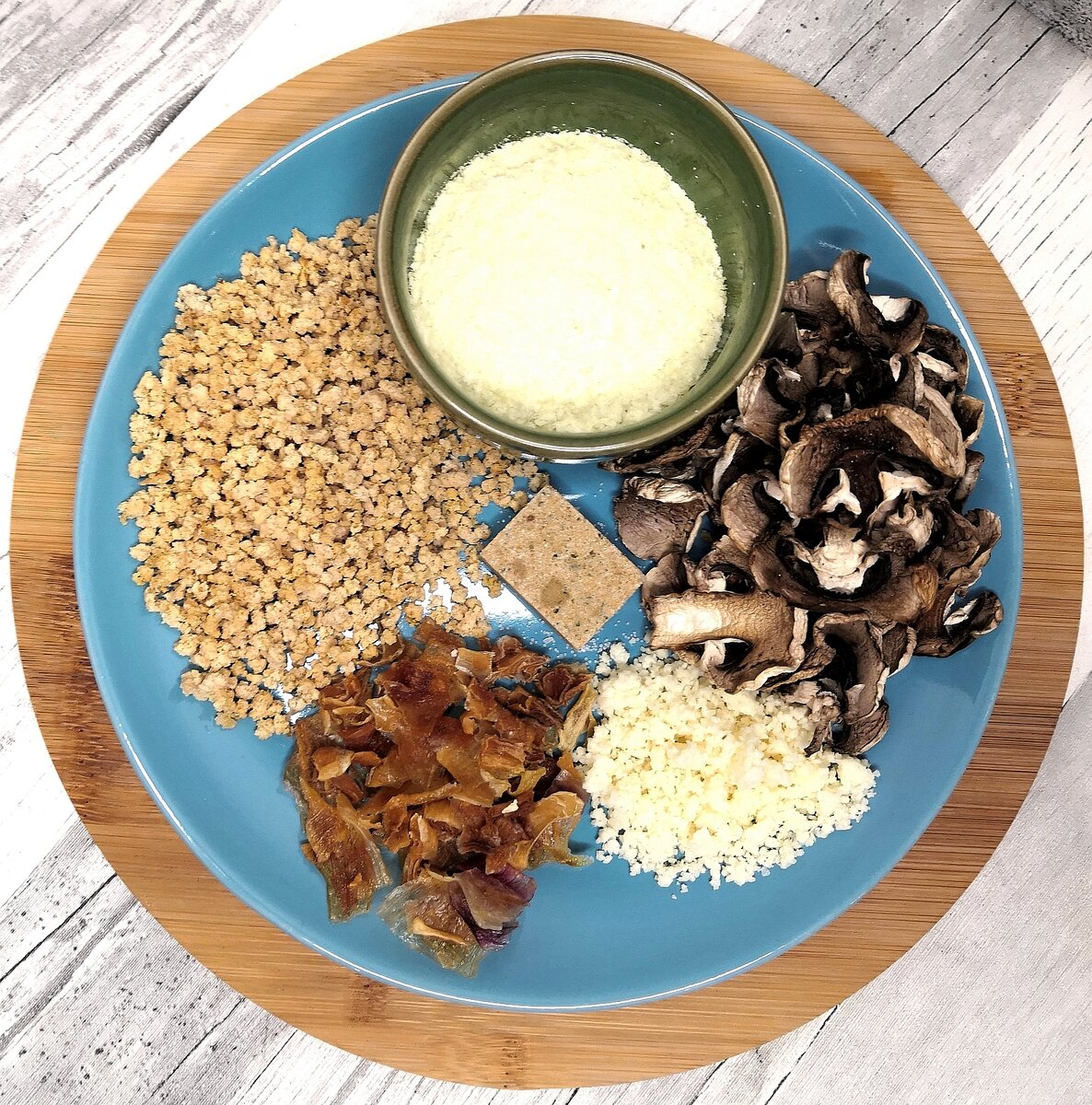 Получилась порция - 507 г из 80 г продуктов, не считая грибного бульона.