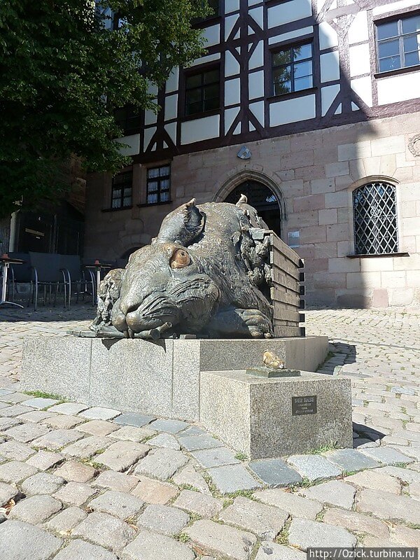 В Нюрнберге живут странноватые немцы (а какие еще они должны быть, если здесь жил человек, который изобрел глобус!), которые соответственно странным образом решили увековечить память одного из своих горожан, установив памятник-карикатуру.Однажды, прогуливаясь по окрестностям Нюрнберга, Альбрехт Дюрер подобрал маленького зайца и поселил в его в своем доме, который впоследствии стал героем многих его произведений. И вот, вместо трогательного рыжего зайчика, горожане установили скульптуру, которая представляет собой огромную тушу кролика, раздавившего человека и которого уже начинают пожирать зайцы поменьше. Наверное это имеет глубокий философский смысл или намекает на тонкий юмор нюрнбержцев. Бешеный кролик расположился прямо напротив дома Дюрера.Нюрнберг изобилует очень оригинальными памятниками. Вот «Собор Св. Лаврентия», так случилось, что в этой церкви не один, а двенадцать алтарей, и три органа.Или взять фонтан Der Schöne Brunnen, т.е. (буквально) Прекрасный фонтан, возраст которого уже перевалил за 600 лет, колонна которого не случайно напоминает готической шпиль, так как её должны были поставить на одну из церквей, но у города не было денег, и ее водрузили на фонтан. Всё просто!Аллегорические фигуры на фонтане тоже не простые, а изображают святых, церковных отцов, христианских и еврейских героев: рядом с Юлием Цезарем, Александром Македонским, Карлом Великим, королем захваченной крестоносцами Палестины Готфридом Бульонским и варварским королем Хлодвигом помещены Гектор, Иуда Маккавей, Иисус Навин, Давид; над ними возвышаются статуи Моисея и 7 пророков. На кованой ограде есть золотое кольцо, как оно было вставлено в решётку, до сих пор остаётся загадкой. Кольцо надо покрутить и загадать желания. Говорят, что не только туристы так делают, но и сами славные горожане.Мне еще очень понравилась необычная скульптура "Корабль дураков", посвященная известной картине Иеронима Босха и одноименной книге Себастьяна Бранта. Дураки грузятся на корабль, на котором намереваются уплыть в страну глупости (Наррагонию).Еще один знаменитый горожанин Ганс Сакс хорошо зная слабости и грешки своих соотечественников, в своих произведениях посмеивался над их проступками и проделками. Например, в своей Шлаураффии, посвященной нюрнбержцам, Сакс повествует о сказочной стране лентяев, где текут молочные реки, по воздуху летают жареные гуси, куры и голуби, попадающие прямо в рот ленивцу, бегают жареные свиньи с ножом в боку, за безделье платят деньги, а самого ленивого и тупого выбирают в короли. Но Ганс Сакс очень гордился тем, что является гражданином славного и вольного города: в "Похвальном слове городу Нюрнбергу" (1530) он с гордостью пишет о Нюрнберге и его повседневной жизни. Смотри, как стройно и красивоТут улицы проведены.Отсюда все они видны:Их здесь – ни много и ни мало –Пять сотен с лишком ныне стало;А лишек – двадцать восемь точно.И все-то вымощены прочно!Колодцы – сто шестнадцать счетом – Полны до верха, А ещё там фонтанов дюжина водой всех оделяет даровой.Больших часов у нас шесть штук.Из них четыре бьют все вдруг.Двенадцать в городе холмов,Одиннадцать больших мостов(И все из камня, все как есть!),Ворот же ровным счётом шесть, Притом ещё два малых входа;Десяток рынков для народа. (…) Обилен торг – куда ни глянь!Ещё тут есть тринадцать бань Обществе