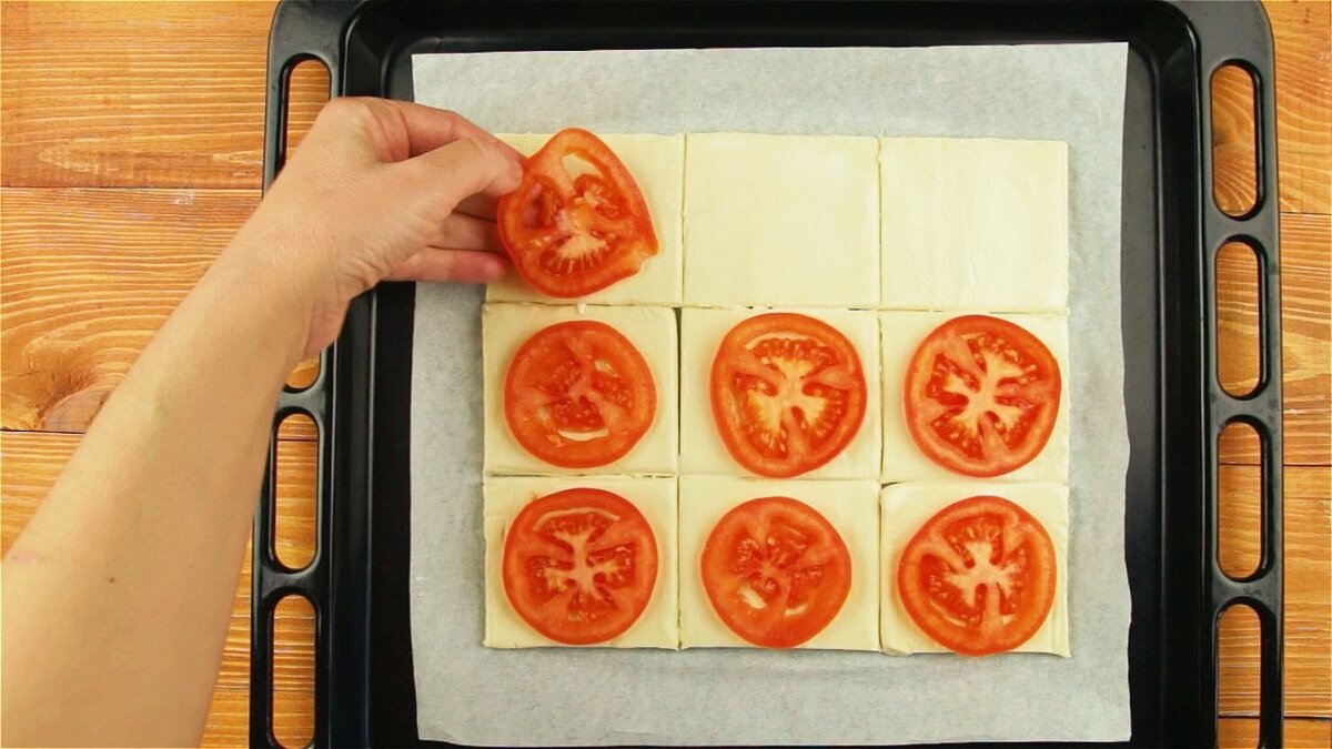 Режем помидоры и раскладываем дольками на тесто (у нас два квадратных куска теста)