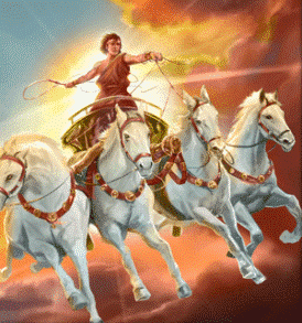 Ночью, пока царствует его сестра - луноликая Селена, он в золотой лодке возвращается назад, где его ждет другая сестра - "богиня с перстами пурпурными" Эос - Утренняя Заря. Красивый миф, правда? Уверена, что многие, если не все, его знают.