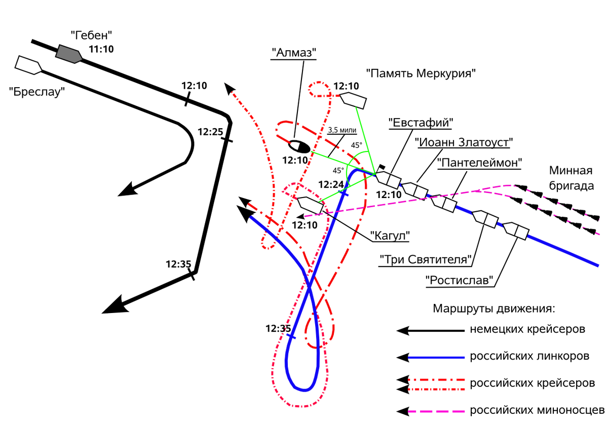 По приказу командующего он начал отход к флоту, а вскоре отвернули и шедшие далеко на флангах между флотом и «Алмазом» крейсера «Память Меркурия» и «Кагул». Отход был своевременным - в скорости российские крейсера значительно уступали «Гёбену», и он мог бы успеть атаковать один из них.