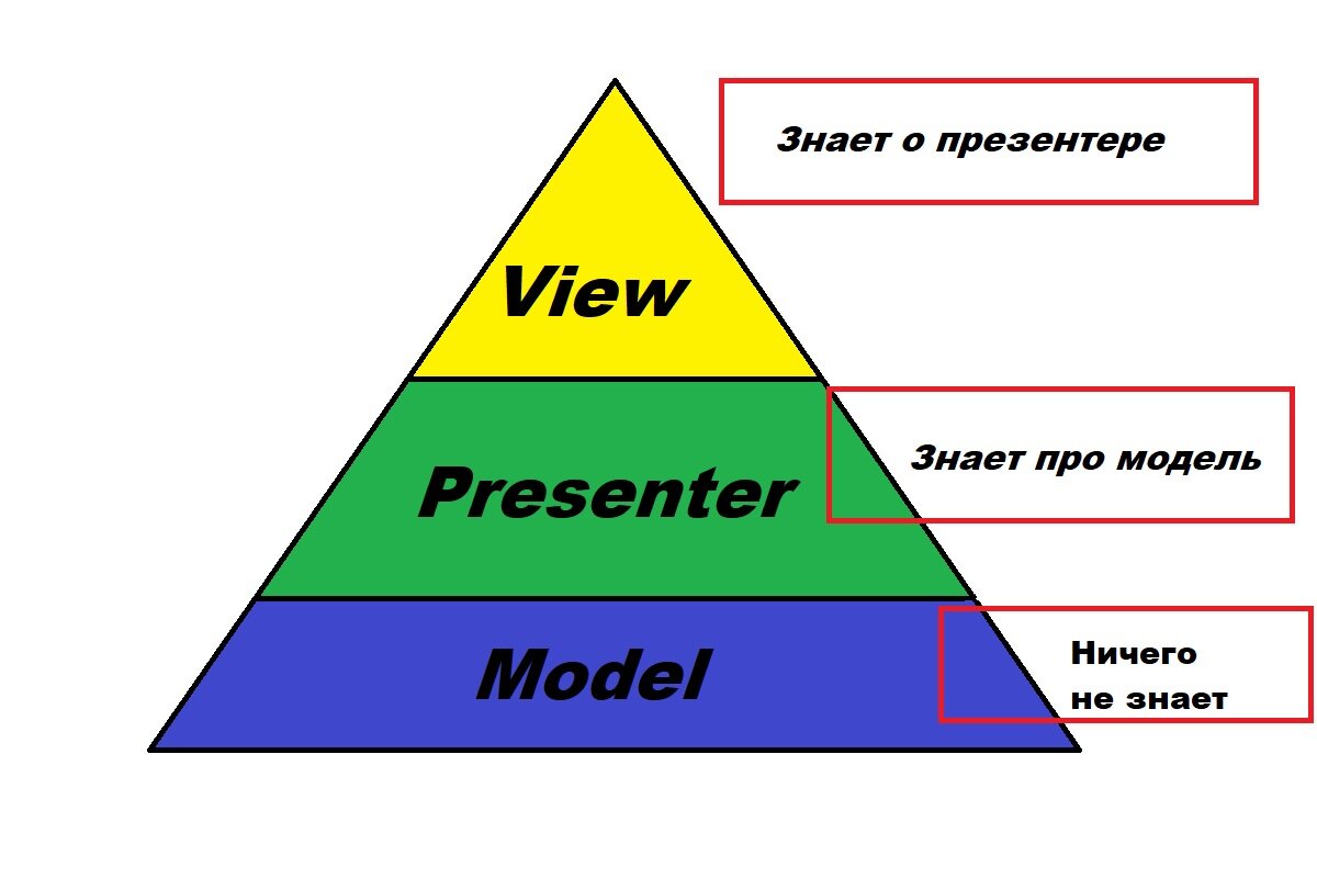 Важное напоминание: более низкий слой ничего не знает о более высоких. Даже презентер не знает про вью. Он взаимодействует с ней через специальный интерфейс, а не напрямую.