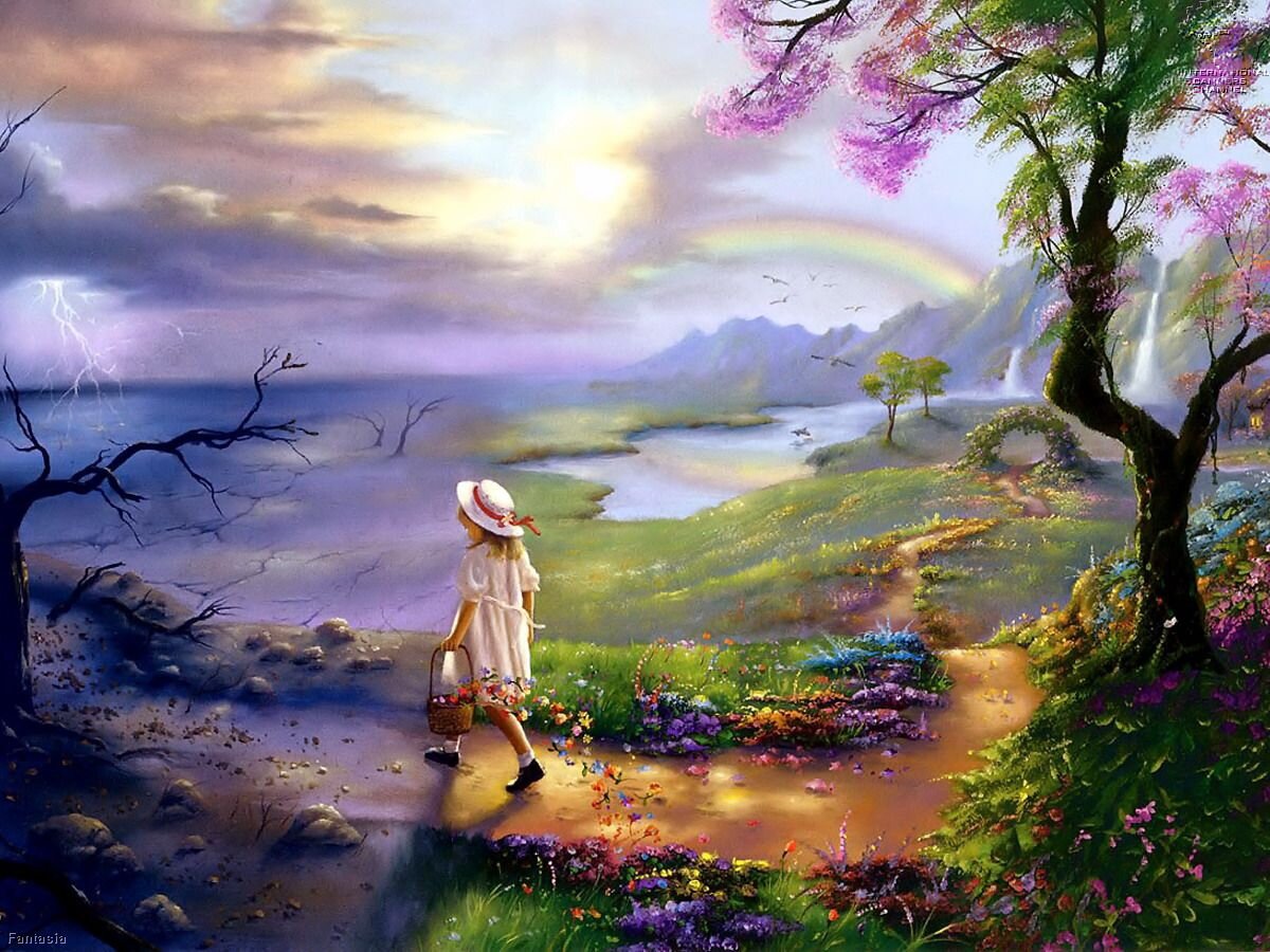 прямо девочке за спину. Оттолкнулась девочка ногами и полетела вниз над лесами, над озёрами, над реками горными, над долинами плодородными. Никогда не видела она такой красоты, аж дух захватило!