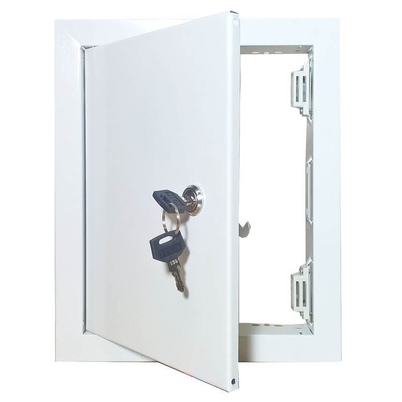 Ревизионные сантехнические люки с замком по умолчанию производят в белом цвете, однако они могут быть окрашены в любой цвет RAL. Оснащают их компактными врезными кулачковыми замками, такие замки еще называют почтовыми. Состоят такие устройства из личинки-цилиндра длиной 16-20 мм и язычка-ригеля длиной 43-50 мм. Сопровождаются комплектом из 2-х английских ключей – это плоские изделия, с симметричными ребрами на гранях. Удобны они тем, что их можно вставлять любой стороной, и к ним можно быстро и недорого сделать дубликаты.