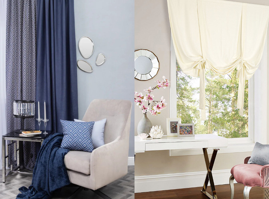 Одним из наиболее интересных и полезных решений в этом направлении станут римские шторы. Последние можно комбинировать с традиционными шторами, но в таком тандеме римские шторы будут выполнять роль затемнения. Неплохим сочетанием станут контрастные тона со сходными паттернами.