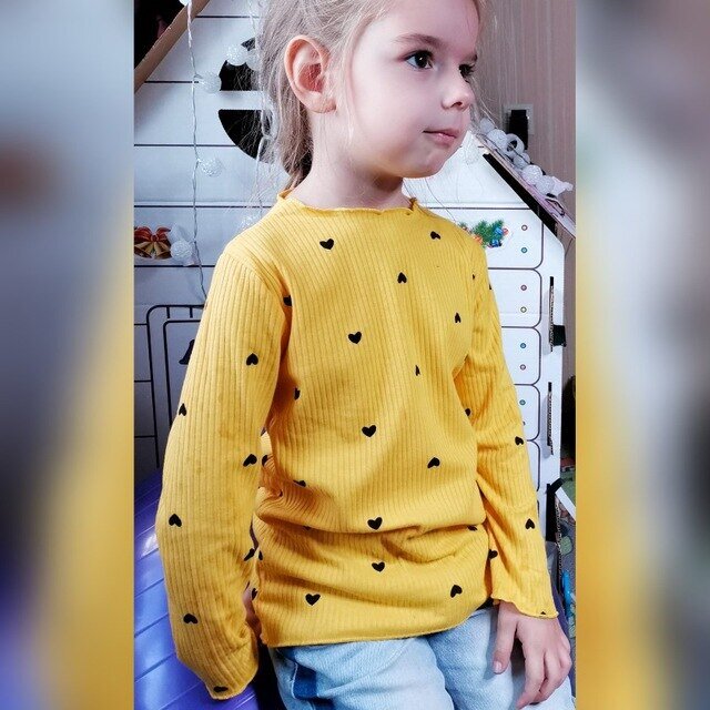 На выбор 9 различных расцветок в двух дизайнах , я выбрала из ткани в рубчик с принтом в виде сердечек. Размерный ряд от 2 до 6Т , я выбрала размер 5Т для дочки ростом 108 см и 16.5 кг подошло идеально, и длина рукава и всего изделия.