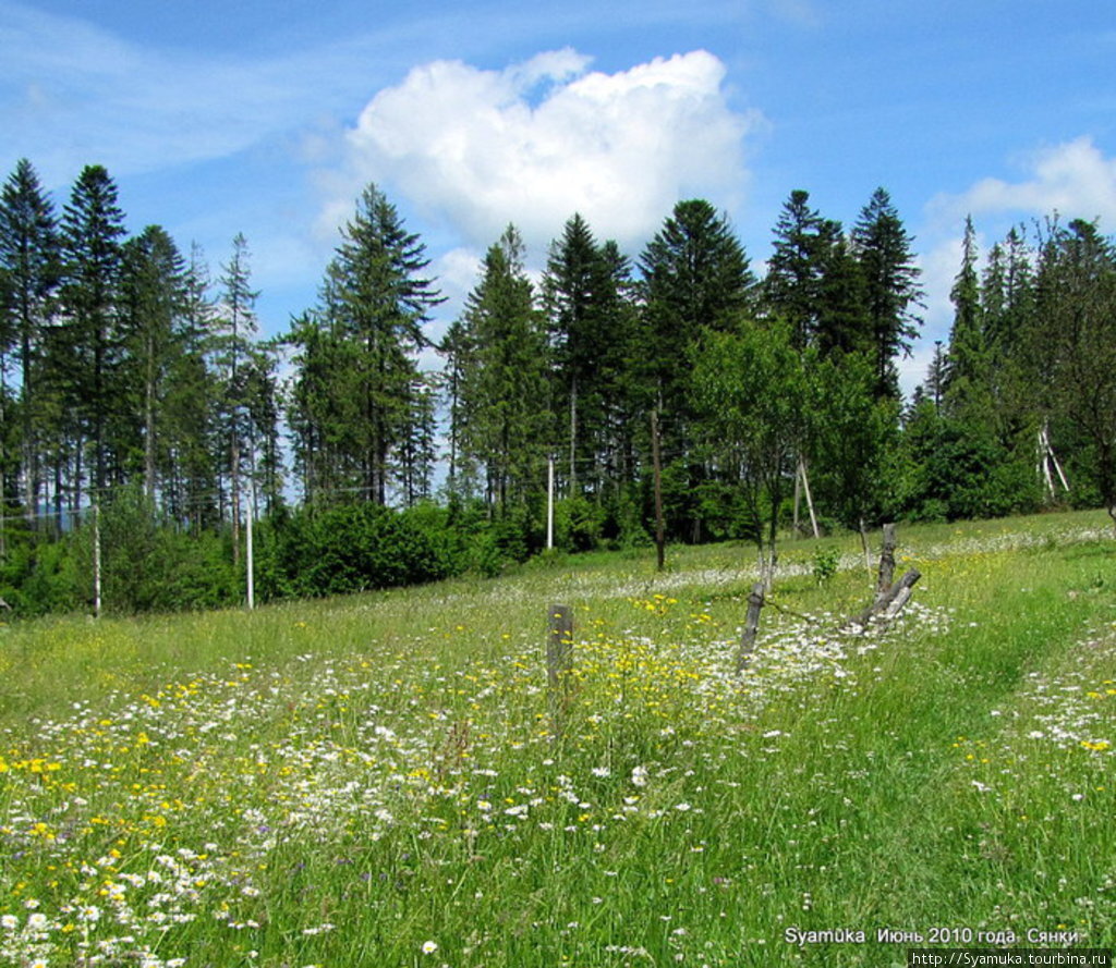 Если взглянуть на карту, то его можно и не найти. Речь идет о селе Сянки Турковского района Львовской области Украины. Посещать Сянки заранее не входило в наши планы. Мысль пришла после того, как мы покинули Турку и рассматривали дальнейшее продвижение в сторону Ужгорода. Село на карте помечено малюсенькой, совсем незаметной точкой. Сянки!? А почему бы и нет!? Во-первых, Сянки находятся в попутном направлении, почти у Ужокского перевала. Во-вторых, там - пересадочная железнодорожная станция. В-третьих - запас во времени у нас был: он появился "благодаря" той же Турке. Прекрасная погода, вопреки всем прогнозам синоптиков, которые пророчили дождь и ненастье, придала решительности: выходим в Сянках. И уже сейчас, спустя время после прохождения маршрута, я с уверенностью могу сказать, что те несколько часов, проведенные в горном селе Сянки, дали незабываемое впечатление, а место стало в ряд лучших на пройденном маршруте. Село Сянки находится, на территории регионального ландшафтного парка «Надсянский», расположенного в горной местности на высоте 650 - 950 метров над уровнем моря в украинско-польской пограничной зоне. От жд платформы видна польская территория.
