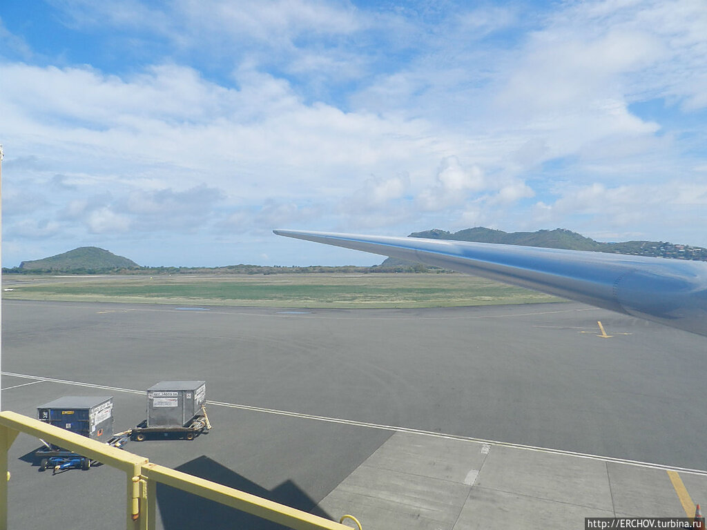 На борту самолёта много темнокожих. Как когда-то прадеды, закованные в кандалы, едут теперь в Новый свет их правнуки, гремя уже золотыми цепями. Полётное время тянется мучительно долго, и, кажется, что время совершенно остановилось. Я даже перестаю смотреть на часы. Вдруг в иллюминаторе появляется красивый берег с зелёными холмами, на которых крапинками сверкают красные крыши домов. Две чёрные горы дополняют пейзаж. Открываются двери, в салон врывается жаркое Карибское лето. Большая часть пассажиров выходит. Сент-Люсия это самостоятельное государство — заходят пограничники и проверяют у оставшихся билеты и паспорта. Далее почти час ничего не происходит, сидим и изнываем от жары. Наконец, появляются три новых пассажира, и занимают свои места. Взлетаем и через 40 минут под аккомпанемент дождя садимся на Тринидаде. Получаем багаж и идём регистрироваться на рейс до Гайяны (Джорджтаун). Нашу туристическую группу в страну впустили без проблем, но при регистрации на рейс начинают конкретно прессовать по поводу визы. Российским гражданам для въезда на Тринидад и Тобаго виза не нужна, но сотрудники аэропорта об этом видимо ещё не знают. Кое-как утрясаем вопрос и регистрируемся на следующий рейс. У меня на рюкзаке разъезжается молния. Стараюсь подобрать себе что-то новое в местных магазинах, но всё бесполезно. Вокруг одни китайские подделки и аляпистые сувениры. В качестве плюса заметим, в аэропорту Порт-оф-Спейна достаточно много всевозможных кафешек. Тринидад и Барбадос два основных транзитных пункта на Карибах. Народу в зале вылета много. Все ждут какой-то свой рейс, соответственно здесь собран некий карибский микс. Белые люди среди этого гербария на глаза совсем не попадаются. Вокруг 90% темнокожих, но одеты они по-другому, нежели их собратья в Лондоне. Стройные негры и мулаты почти все носят кепочку и чёрные аляпистые очки. На теле у них обязательно футболка с надписью или с рисунком, и цепи, цепи, цепи… Женщины красивы – это жгучая смесь африканки, индуски, индианки и мулатки. На груди у них среди всевозможной бижутерии обязательно висит какой-то кулон. В ушах, как правило, серьги в виде кольца, но тоже не золото. И у мужчин и у женщин на открытых частях тела проглядывают кусочки тату.