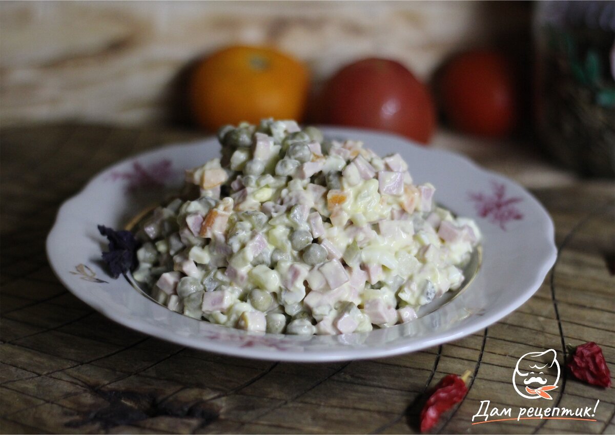 Салат "Оливье" - это классический русский салат, который часто подают на новогодний и рождественский стол. Как правило, это очень сытный и яркий в подаче салат. Чтобы сделать закуску более диетической, можно заменить традиционную майонезную заправку на смесь сметаны, майонеза и лимонного сока. А если вы хотите приготовить питательное диетическое "Оливье", следует заменить майонез на сметану или греческий йогурт, а вместо покупной колбасы добавить вареную куриную грудку. Солёные огурцы в данном случае можно заменить на свежий овощ. Заправляют салат "Оливье" перед подачей, чтобы овощи в составе салата не пустили сок и закуску не потеряла свой внешний вид. Подают салат в глубокой тарелке, горкой на плоском блюде или же в кулинарном кольце. Энергетическая ценность на порцию Сложность рецепта: Ингредиенты: Из расчета на 4 порции (1060 г) Рецепт приготовления: Шаг 1 Шаг 2 Шаг 3 Шаг 4 Шаг 5 Приятного аппетита! Еще больше рецептов для Вашей семьи на каждый день на Дам рецептик! Вам может понр