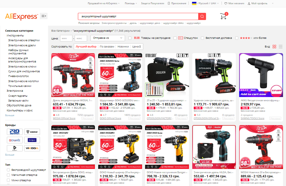 Да, я не стал его ремонтировать и ушёл оттуда и подумал, посмотреть альтернативные варианты на Али. Ввожу в поиске "аккумуляторный шуруповёрт" и вот что я получаю в ответ от Али.
