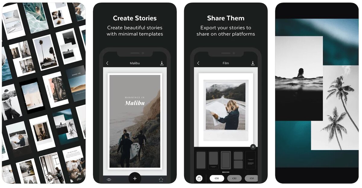 Unfold — пожалуй, самое известное мобильное приложения для создания «Историй». В нём собрано 100 шаблонов — 25 доступно бесплатно, ещё 75 размещены по платным коллекциям. Бесплатного набора вполне достаточно, чтобы оценить сервис и пользоваться им на постоянной основе. Платные наборы стоят 75 или 150 рублей и доступны по покупкам внутри приложения. Можно посмотреть примеры публикаций с этим шаблонами, прежде чем покупать.