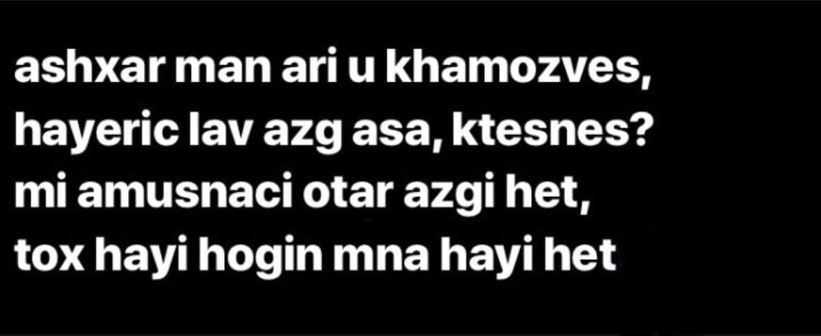Мне безумно нравится фраза: «Mi amusnaci otar azgi het, tox Hayi hogin mna Hayi het». В переводе это значит: «Не женись (выходи замуж) за другую нацию, пусть дух армян будет с духом армян».