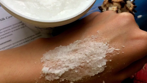 Для скрабирования я беру обычную морскую соль. Перемешиваю ее с любым гелем для душа или же с масскажным маслом, можно мешать с кремом. Довожу пропорции до консистенции жидкой сметаны и пару минут натираю активно все пальцы, внешнюю поверхность рук и ладони. затем просто смываю теплой водой и тщательно промакиваю полотенцем.