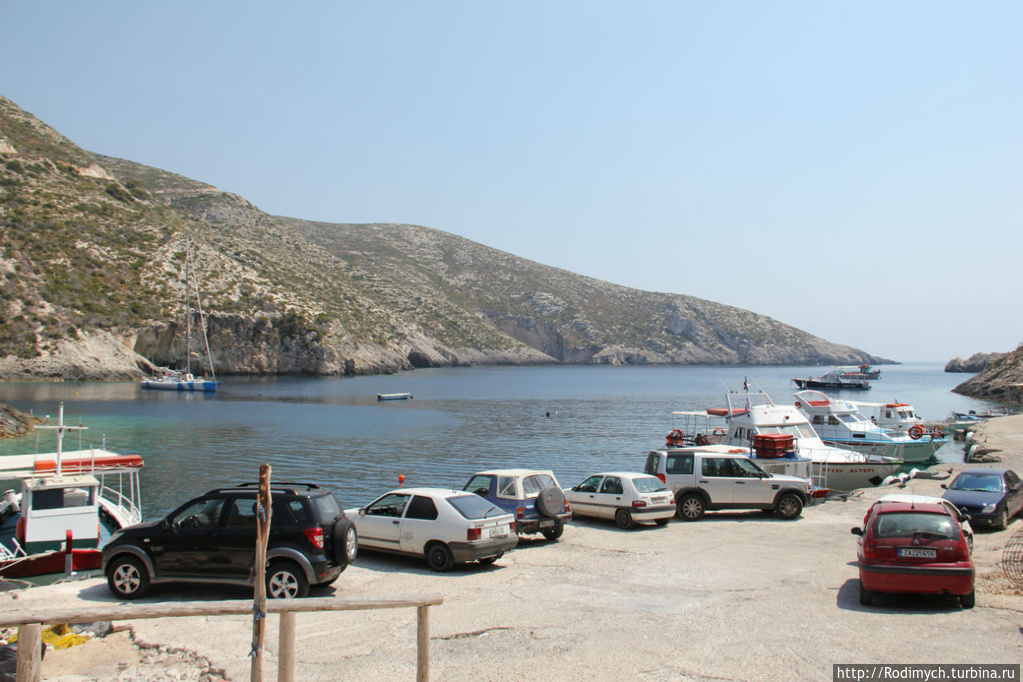 После осмотра сверху бухты Навайо очень хотелось быстро где-то охладиться, поэтому проехав через монастырь Анафонитрии мы оказались в бухте Порто Вроми. Бухта эта чем-то напоминает змеиный язык, она глубокая и в конце раздваивается на две части, первая загибается на запад, вторая на восток. Мы приехали в её западную часть. Пляж очень маленький, но и народа