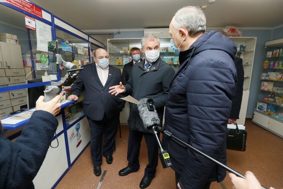 Сегодня спикер Госдумы РФ Вячеслав Володин незапланированно посетил одну из аптек в Ленинском районе Саратова (ул. Мостовая, 37а). Его сопровождали глава региона Валерий Радаев, министр здравоохранения региона Олег Костин и другие.