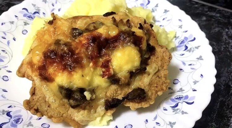На получившееся мясо выкладываем грибы, которые обжарили с луком на растительном масле. Далее майонез, кетчуп, сыр.