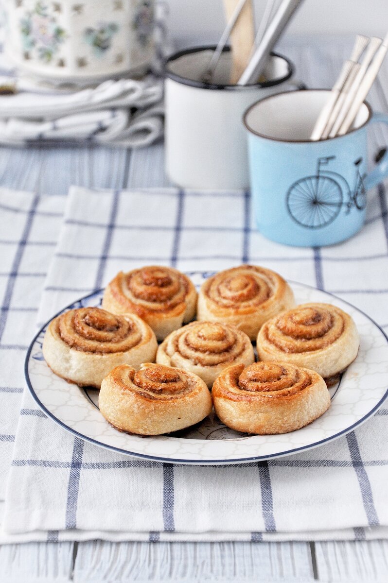 Раскатать в прямоугольник готовое слоеное дрожжевое тесто. Смазать маслом сливочным или растительным (щедро смазать, чтобы начинка хорошо прилипла). Посыпать сахаром с корицей, свернуть рулетом, порезать острым ножом или ножом для пиццы на сегменты, по желанию смазать разболтанным яйцом. Выпекать при 180 градусах до румяности, около 10-15-20 минут (зависит от духовки).