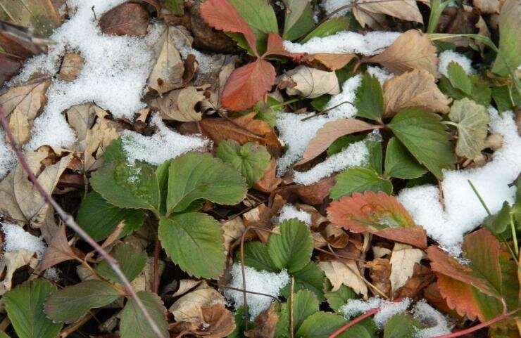 - Даже если выпадет тонкий слой снега, серьезный мороз погубит корневую систему земляники.