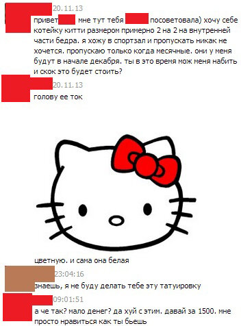 Привет, я Лена, увлекаюсь гримом и мэйкап-перевоплощениями, а моя основная деятельность - татуировщик. Бью татухи уже больше семи лет, и мне каждый день приходится отвечать на одни и те же вопросы. Но есть некоторые сообщения, которые поражают своей странностью, и сегодня я поделюсь с вами некоторыми из них. 1. "Привет, Kitty" То есть мало того, что это изначально очень странная задумка - делать такой рисунок на внутренней части бедра. Но ещё и человек хочет прийти ко мне и сделать татуировку между ног во время месячных %) Вот оно, уважение к татуировщику! 2. Мне же уже 15! Далеко не все понимают, что тату в 15 лет это плохая идея по многим причинам. Ветер в голове, не до конца сформированные взгляды и поиски себя. Почти в 100% такие истории в будущем приводят к перекрытию татуировки. 3. А что непонятного? И как тут понять, про какой именно круг он говорит? Внешний контур скотча, внутренний? Даже если пытаться разбираться в его просьбе, остается очевидным - человеку лень даже нормальн