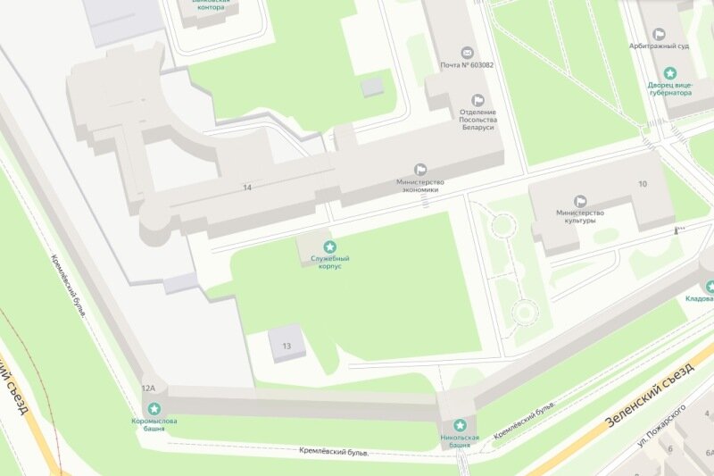 Речь идет о территории кремля, прилегающей к административным корпусам №14 (строящийся Дом правительства Нижегородской области) и южным крылом корпуса №2 (в корпусе находится Заксобрание, министерство