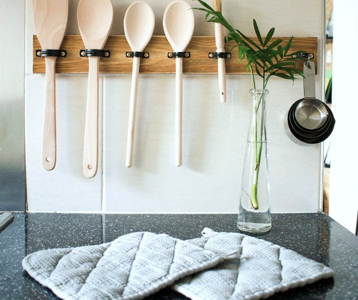 И наконец, важная составляющая кулинарного процесса, особенно у молодых хозяек - поваренная книга. Однако процесс готовки зачастую сопровождается испачканными страницами. Чтобы сохранить руководство к действиям в чистоте, можно использовать самую обыкновенную вешалку для брюк, закрепив нужные страницы зажимами и подвесив ее на ручку любого шкафа.