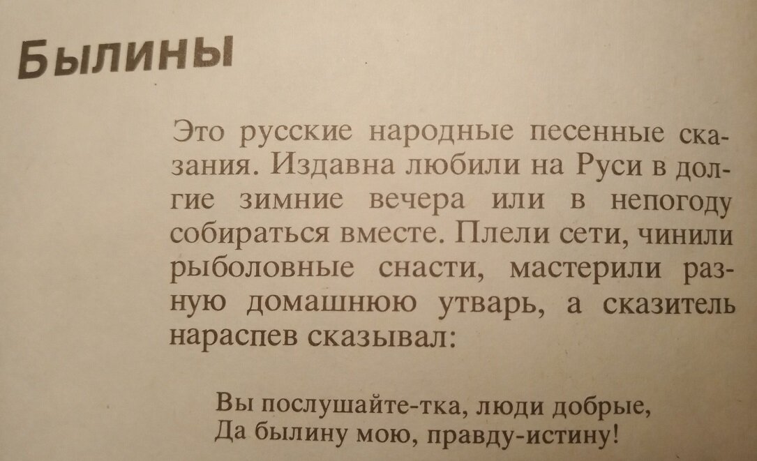 Это русские народные песенные сказания. Издавна любили на Руси в долгие зимние вечера или в непогоду собираться вместе. Плели сети, чинили рыболовные снасти, мастерили разную домашнюю утварь, а сказитель нараспев сказывал: