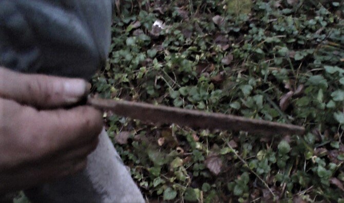 Золота не нашел... Вернулся к жене "не соли нахлебамшись", но гордый и уставший. Ибо, 2-3 кубометра грунта с корнями перелопатил, как-никак... А у нее - клюет... И хорошо! И на удочки и на спиннинг. Две щучки и с десяток белой рыбки... Собираю свой спин и ставлю самую мелкую вращалку. Щас я проведу мастер-класс!! Тут засада... У жены спин маленький и легкий. А у меня 3 метра и с тестом на "крокодила"... Люблю тяжелый джиг на больших глубинах... Ну, да ладно. Зацепившись за все ветки и палки, кое как, но смог сделать небольшой заброс! Блесенка улетает на тот берег и... зацепляется за какую-то березку... Минут через пять, моей борьбы с обстоятельствами, нескромно ржущая жена, попросила так громко не ругаться... Мол, хоть и лес, но и тут могут быть люди, женщины и дети... Блесну я спас и, даже "покидал" ее, но... Вы можете себе представить "заброс" на 5 (пять!!) метров и без права на ошибку? Не знал, что так смогу... При очередной проводке что-то прицепилось. Думал, что пучок травы. Оказалось - окунек... Не на много больше блесны... Отпустил бы, но он очень неудачно, глубоко заглотил тройник... Нет, "такой хоккей нам не нужен"... А у жены опять щучка... Раз в 15 больше моего окунька... Не в силах больше слушать, про "рыбака в 3-м поколении" и наблюдать ее счастливую лицо - бросаю снасть и беру детектор! Сейчас пойду и найду! Да такое, чтоб - "дорого и богато"... И вообще - женщина на рыбалке - не к добру! Это плохо! Им вышивать надо! Крестиком...Чтоб вы понимали... Брожу среди 100-летних елок, машу прибором, внимательно смотрю под ноги (во избежание Шкварки-2))) и по сторонам (во избежание Медведь - 1))) - сигнал! Слабый отзвук в цветмет и - глубоко! Годограф рисует - ржавое железо, но мозг советует - копай! Доверился мозгу... Да, глубоко. И - ржавое железо... Но - это некое изделие, явно - кованное и очень похоже на шип!