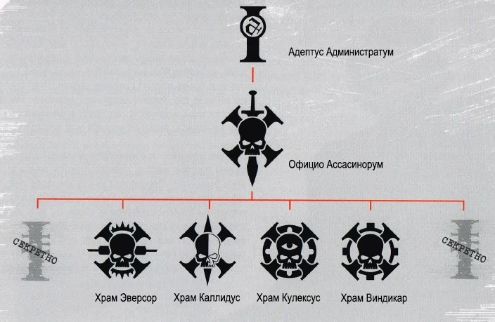 Так сказал Император в первые годы Великого Крестового Похода, когда несколько его самых верных слуг собрались вместе стремясь воплотить свои мечты об объединении человечества. Эти мужчины и женщины не имели себе равных в искусстве убийства и хитрости. Они выслеживали и уничтожали тех, кто бы мог помешать плану повелителя человечества. Они действовали в тайне предпочитая не получать от Императора похвалы за свои действия. Поскольку они чувствовали себя не достойными такого внимания среди великих жертв и разрушений. Они убивали врага тихо, незримо идя из мира в мир и гарантирую, что обещания покоренных народов и правителей будут выполнены и что не давно установленные планетарные правительства останутся верными. Со временем эти слуги поняли, что они не могут прятаться от своих смертей всегда и что их навыки должны передаваться новому поколению, а великая работа продолжаться. После этого они наконец раскрыли свое существование Императору. Повелитель Человечества догадывался о необходимости существования убийц и страшном долге который они взяли на себя. Поэтому он ни чуть не удивился и даже похвалил их за проделанную работу. По его приказу были созданы шесть храмов в которых начали обучать самых искусных убийц.