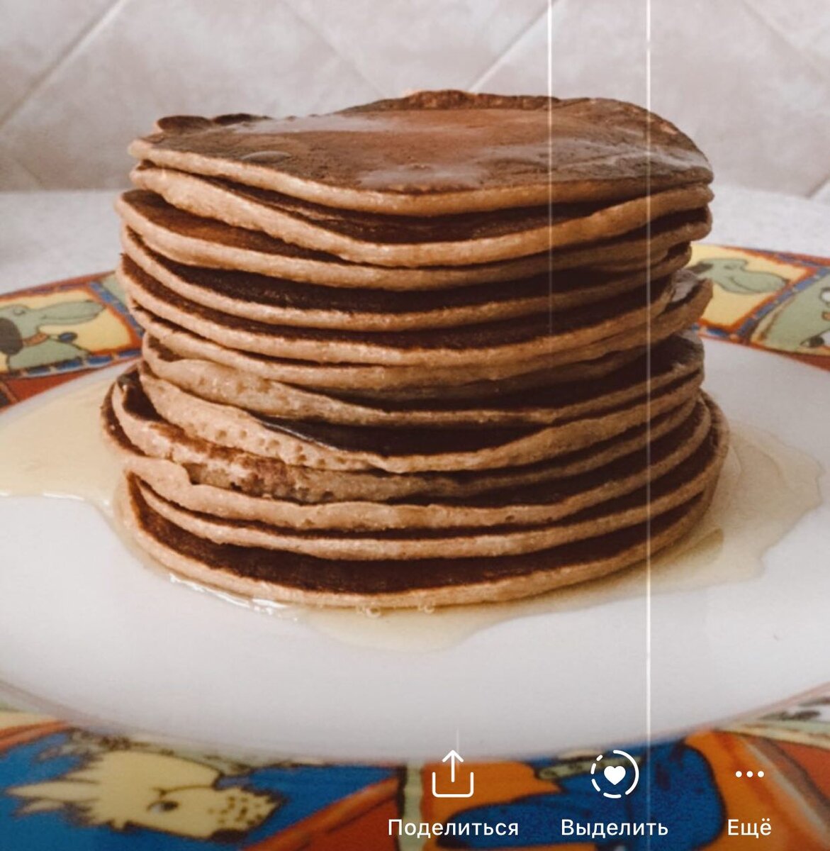 Смешиваем яйцо и ложку сахара. Добавляем молоко комнатной температуры и муку. Перемешиваем. Добавляем масло и разрыхлитель. Тесто должно получиться, не как для блинчиков, не слишком жидким. Жарим на сухой сковороде. Украшаем как хотите, я взяла мёд. Можно взять фрукты, варенье и всё чего вашей душе угодно.