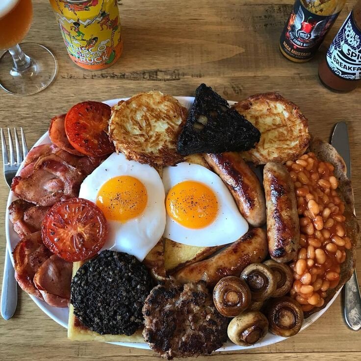 Английский завтрак - full English breakfast - считают одним из главных кулинарных символов Англии. Он обычно состоит из яичницы-глазуньи, нескольких ломтиков жареного бекона, пары жареных сосисок, припущенных помидоров, белой фасоли в томатном соусе (обычно Heinz), тосты с маслом и джемом и иногда кровяную колбасу (black pudding) и жареные шампиньоны. А в качестве напитка к английскому завтраку предпочитают апельсиновый сок или чай с молоком . Всё это традиционная британская пища с большой сытностью и калорийностью. Британцы уже перестали есть его каждый день,но завтрак всё равно считается национальным достоянием.