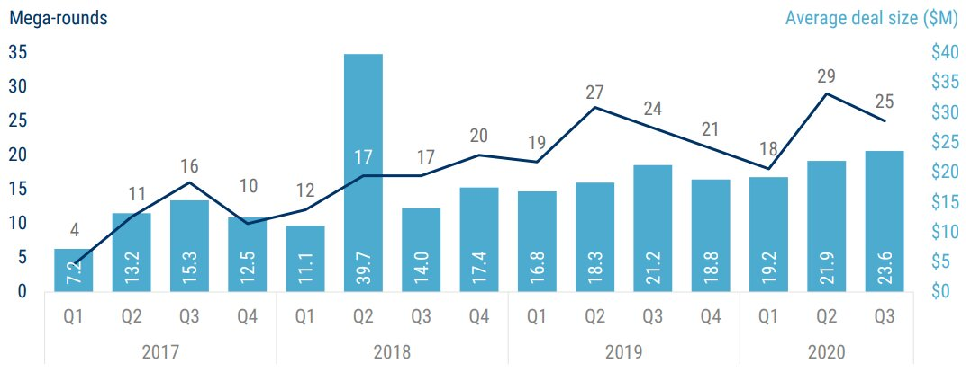 Специалисты отметили, что в третьем квартале 2020 года объем инвестиций, привлекаемых в мегараундах (стоимостью $100 млн и более), вырос на 24% по сравнению с аналогичным периодом прошлого года. При этом объем средств, привлекаемых в ходе более мелких сделок, за тот же период времени снизился на 16%.
