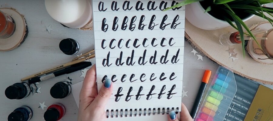 Для начинающих леттеринг на первом этапе выглядит как уроки каллиграфии: вам нужно просто найти образцы красивых шрифтов, которые вам нравятся, и начинать прописывать их в тетради или разлинованном альбоме. Прописывайте букву за буквой, и строчные, и заглавный, совсем как мы это делали в первом классе школы, соблюдая порядок изображения разных частей букв и соблюдая одинаковое расстояние между ними.