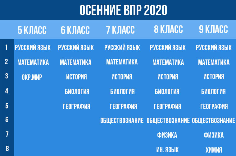 В петиции акцентируется внимание на том, что нельзя исключать возможности повторного перехода на дистанционный формат обучения в 2020-2021 учебном году, а потому проведение ВПР осенью не только не продемонстрирует реального уровня знаний, а и лишит школьников и педагогов таких важных часов, которые необходимы для очного изучения предмета. Инициативу поддержали уже более 20 000 участников, но Сергей Кравцов настаивает на обязательном проведении осенних ВПР в 2020-2021 учебном году. Расписание осенних ВПР Проведение осенних срезов для 5-9 классов регламентировано приказов Рособрназдора №821 (от 05.08.20) в период с 14.09.20 по 12.10.20. Согласно данному документу вопрос участия в срезах учащиеся выпускных 9-х классов, могут решать администрации школ, но для 5-8 классов ВПР будут обязательными. В приложении к приказу №821 указаны предметы, по которым в сентябре-октябре будут проведены контрольные срезы