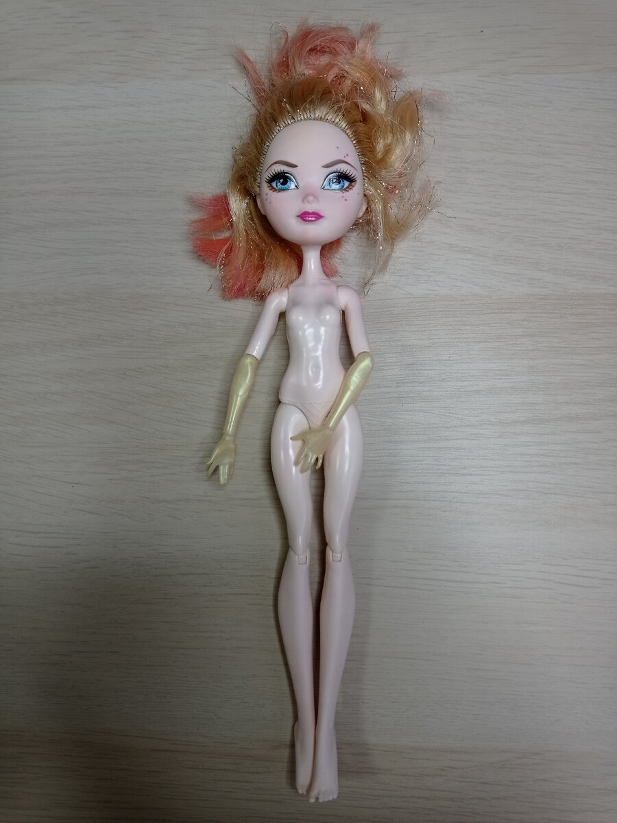 Всем привет! Меня зовут Александра, и я увлекаюсь преображением (ООАКом) кукол Monster High и Ever After High. Несколько дней назад я начала работу над новой куколкой - превращаю Эппл в красавицу Белль. Куколка приехала от заказчицы Татьяны вместе с другими Эверяшками. Почитать об этом можно здесь. Вот в таком состоянии была Эппл. Нет, она совсем не была грязной, даже волосы были чистые. Но куколкой активно играли, красили ей волосы, возможно даже немного подстригли их. От красящих мелков на лице и плечах куклы алели следы, которые Татьяна не смогла отмыть обычными моющими средствами. Но чистый спирт без труда отмыл все розовые следы. Корни волос были темные, возможно пошла реакция от нитей люрекса, который присутствовал в волосах. На линии роста волос тоже остались темные пятна, но они отмылись ацетоном после того, как я удалила волосы. Куколка очищена от пятен, осталось лишь чуть заметное пятно над левым глазом, но его, я думаю, удасться вывести 3-х процентным оксидантом от крас