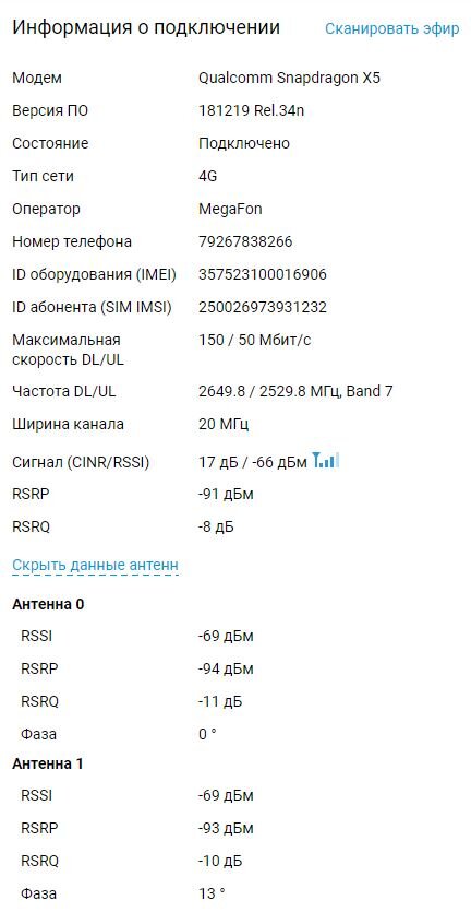 Мы видим частоты, на которых работает модем, номер band’а, идентификатор базовой станции, расстояние до нее и, что немаловажно, ширину канала. Максимальная скорость на модеме Snapdragon X5 составляет 150/50 Мбит/с (LTE Cat.4), но эти показатели достижимы только при канале 20 МГц. А такой вам с наибольшей вероятностью предложит только Мегафон, потому что у него ресурсы в сетях LTE посерьезнее, чем у коллег по бизнесу. На 15 и даже 10 МГц работать тоже будет. Но медленнее.