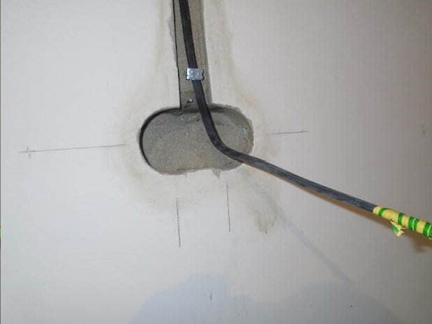 Самое интересное произошло, когда начал устанавливать подрозетник на алебастр. Когда начал готовить смесь сначала она категорически не хотела становиться нужной мне консистенции, была слишком жидкой, а потом практически в один момент взялась колом. Пришлось долго отдирать его из ведра. После этого я решил попробовать, как было на видео в интернете вмазывать подрозетник жидким алебастром. В углублении для подрозетника он держался очень плохо и постоянно вытекал. Целиком замазать пространство сверху подрозетника не получилось. В кокой то момент алебастр быстро взялся колом. Я только и успел выровнять подрозетник. Что хорошо буквально через минут десять подрозетник уже мертво держался и я смог сразу завести провода в подрозетник.