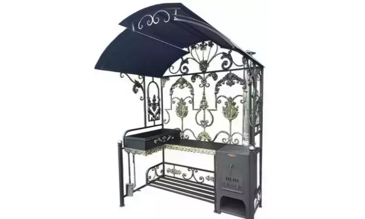 Ажурная ковка ручной работы украшает все элементы мангала. Жаровня с ребрами жесткости, предотвращающими деформацию, снабжена прорезями для установки 10 шампуров. Скатная крыша с отверстиями для удаления дамы позволяет готовить в любую погоду.