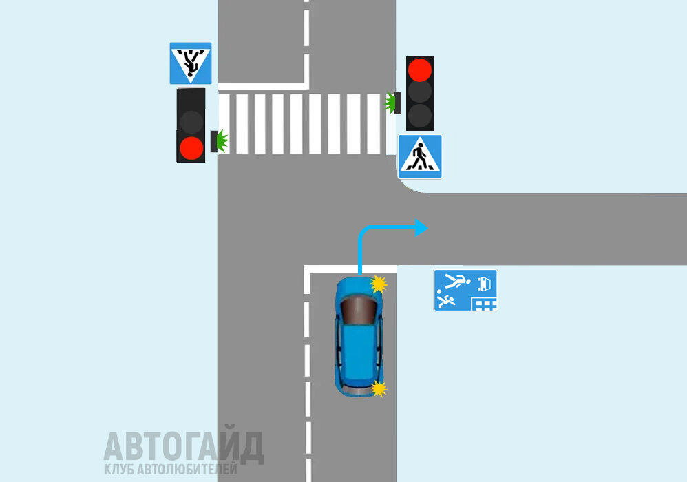 Синяя машина хочет повернуть направо во двор. Водитель включает поворотник, но впереди замечает светофор, который стоит уже после заезда, но сигнал его горит красным. Более того, прямо перед поворотом нарисована стоп-линия. Может ли водитель повернуть направо до светофора, сигнал которого горит красный или нужно остановиться и ждать зеленого по ПДД?