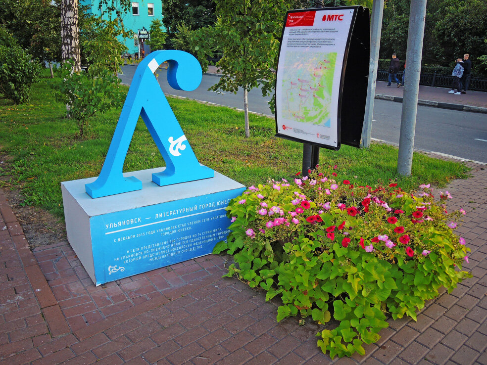 Продолжаю виртуальную прогулку по улице Гончарова в Ульяновске. Мы остановились на перекрёстке с улицей Ленина. На бульваре в этом месте можно увидеть ещё один объект. Это знак, установленный в честь присоединения Ульяновска к креативной сети городов ЮНЕСКО. Работа этой сети направлена на развитие культурной и творческой жизни как внутри самих этих городов, так во взаимодействии их друг с другом. Заявляется, что Ульяновск - единственный город, который представляет Россию в этой организации.