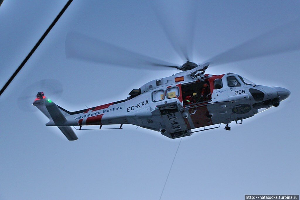 Накануне захода на Тенерифе,вечером, "Седов" стал участником учений, организованных испанской береговой охраной. Вероятно, испанцы решили не упустить возможность тренировки и усложнить себе задачу попыткой спасения условного пострадавшего с настоящего, с мачтами и такелажем, парусника.Зависнуть вертолету над палубой "Седова" практически невозможно,